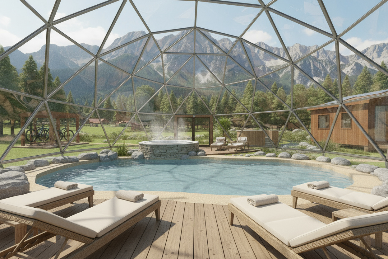 biological natural pool and wooden dome with our partner Eaulistic by NAO, nordic bath, fitness facilities